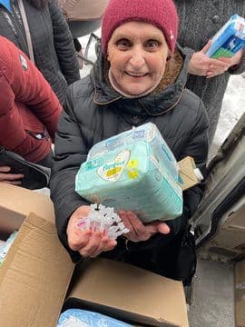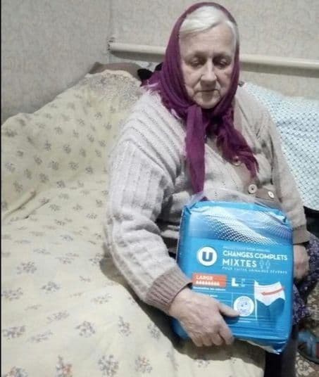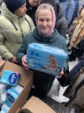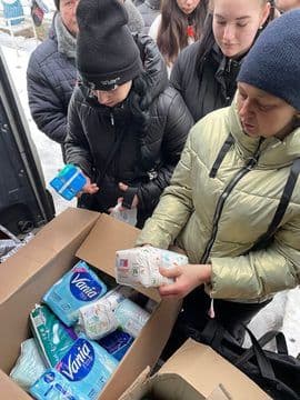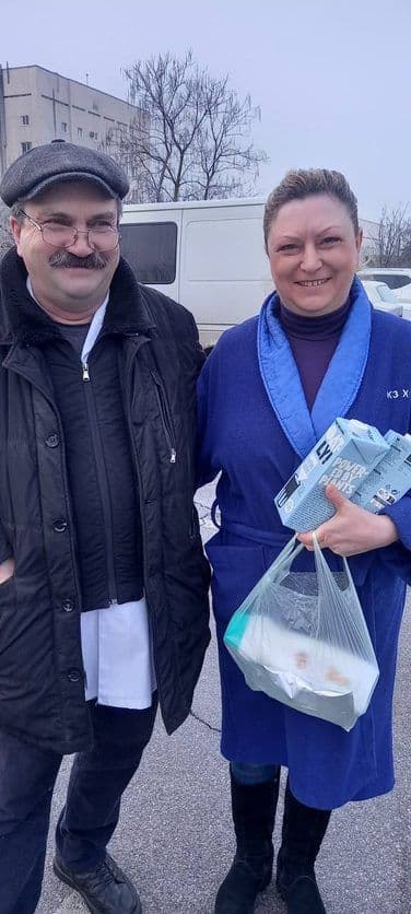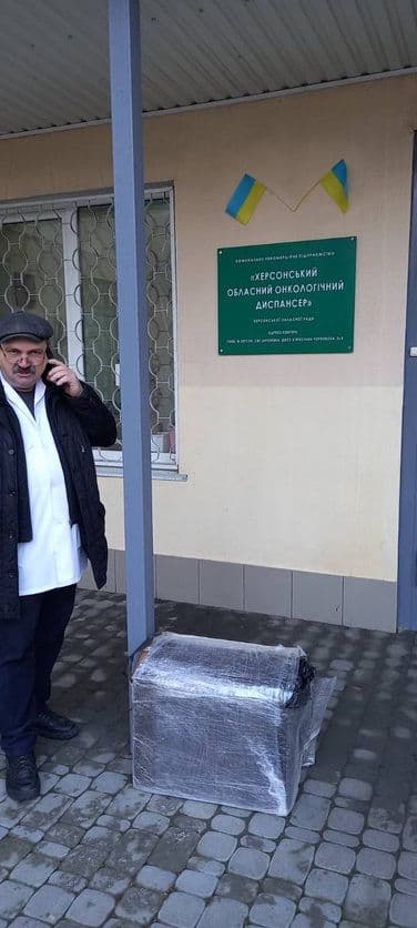 Delivery partners, the Global Ukraine Organization, support distribution of food, shampoo, hygiene items and milk to Kherson’s regional oncology dispensary.